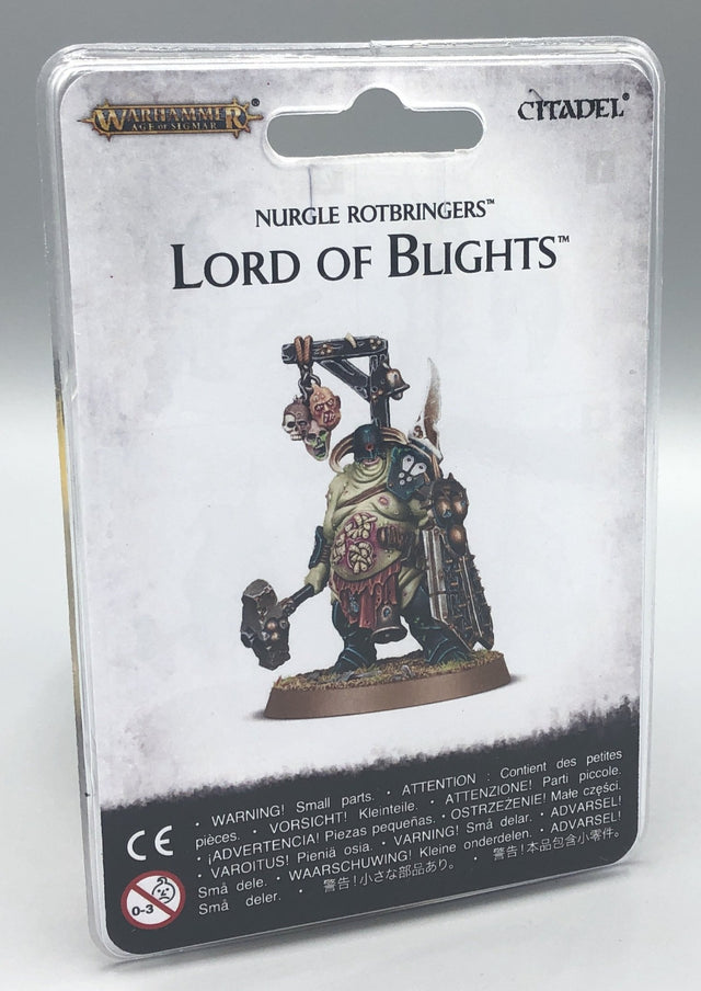 This multi-part plastic kit contains the components necessary to assemble a Lord of Blights. Bloated and bursting, like most of the Rotbringers, his silhouette is noticeably dominated by the makeshift gallowrack nailed to his back, from which 3 ripening heads dangle. He wields an enormous, dented bubotic hammer along with a vermid shield – these are both covered in the appropriate Nurgle icons, with the shield being especially spiked and disease-ridden. His belt, overwhich his unpleasantly distended and torn belly flops, features a plague knife. The aforementioned belly is disgorging maggots at an alarming rate – it’s difficult to tell how the Lord of Blights feels about this, as his face is covered almost entirely by his helmet, through which one eye socket peers curiously.