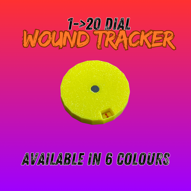 Our own designed 1 to 20 dial wound trackers allow you to keep track of your wounds on your models in this nice and easy to read dial. Using 2 x neodymium magnets and multicolour printing to bring our wound tracker to life, the magnets also allow for easy stacking of multiple trackers when storing them.