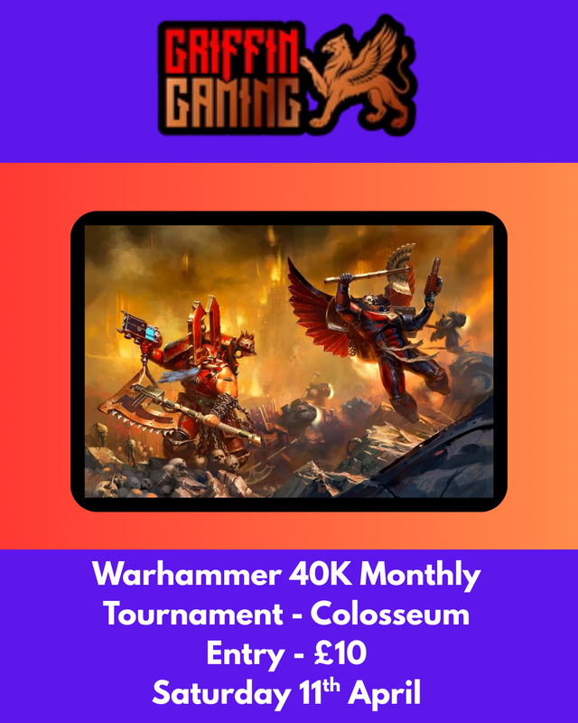 Join Griffin Gaming's Warhammer 40K Monthly Tournament featuring the intense Colosseum game mode ruleset.