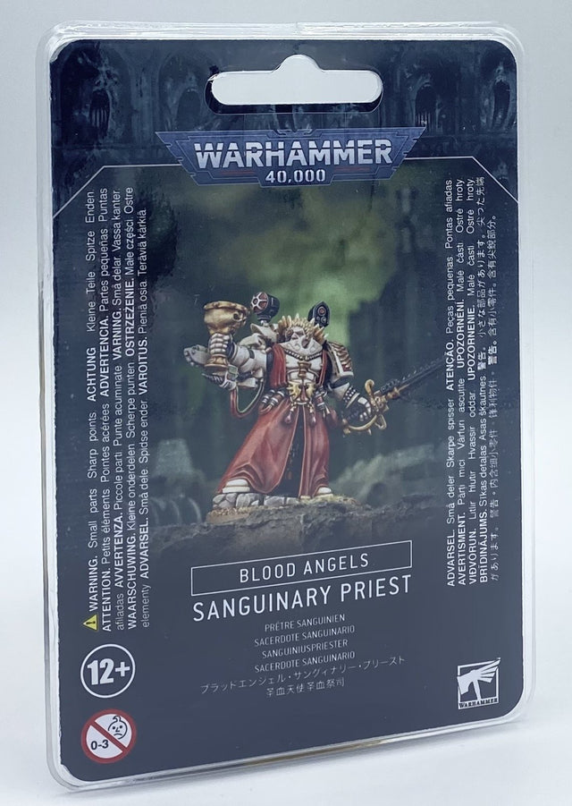 - This 11-piece plastic kit makes a Blood Angels Sanguinary Priest armed with a double-edged chainsword. He holds aloft a blood chalice and is equipped with a narthecium, the instrument of all Space Marine Apothecaries. It also includes a scenic 32mm round base.