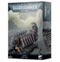 The Necron Ghost Ark is a large model with an imposing presence in a collection of miniatures. Immense engines sit at the rear of the model, and its frame displays detailing such as orbs and dynastic glyphs. A Necron Lord sits atop the Ghost Ark in a commanding position. In front of the Lord, a line of Necron Warriors is positioned as if standing inside the gargantuan ribcage of some primordial beast. The Ghost Ark also contains formidable weaponry with five gauss flayers on each side.