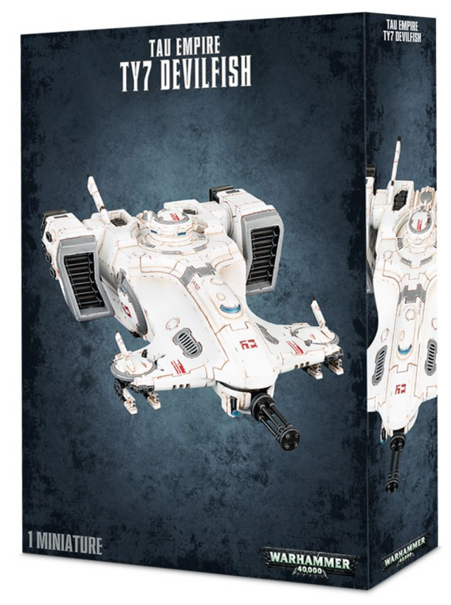 This boxed set contains 1 multi-part plastic T'au Devilfish APC with a variety of optional parts and weapons.